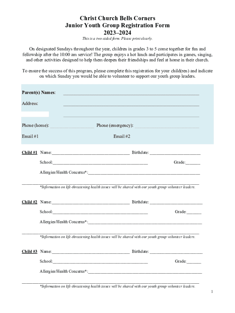 Christ Church Bells Corners Junior Youth Group Registration Form 20232024 This is a two sided form. Please print clearly. On designated Sundays throughout the year, children in grades 3 to 5 come