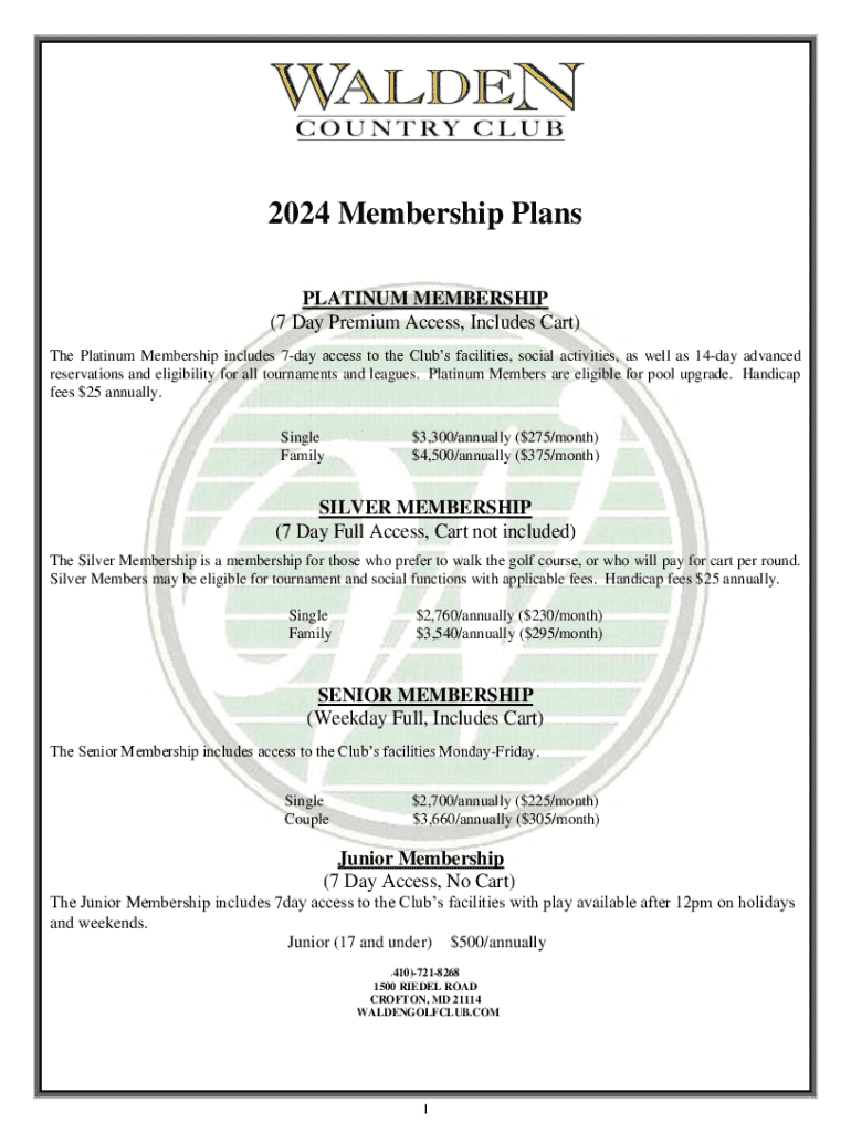 2024 Membership Plans PLATINUM MEMBERSHIP (7 Day Premium Access, Includes Cart) The Platinum Membership includes 7day access to the Clubs facilities, social activities, as well as 14day advanced reservations
