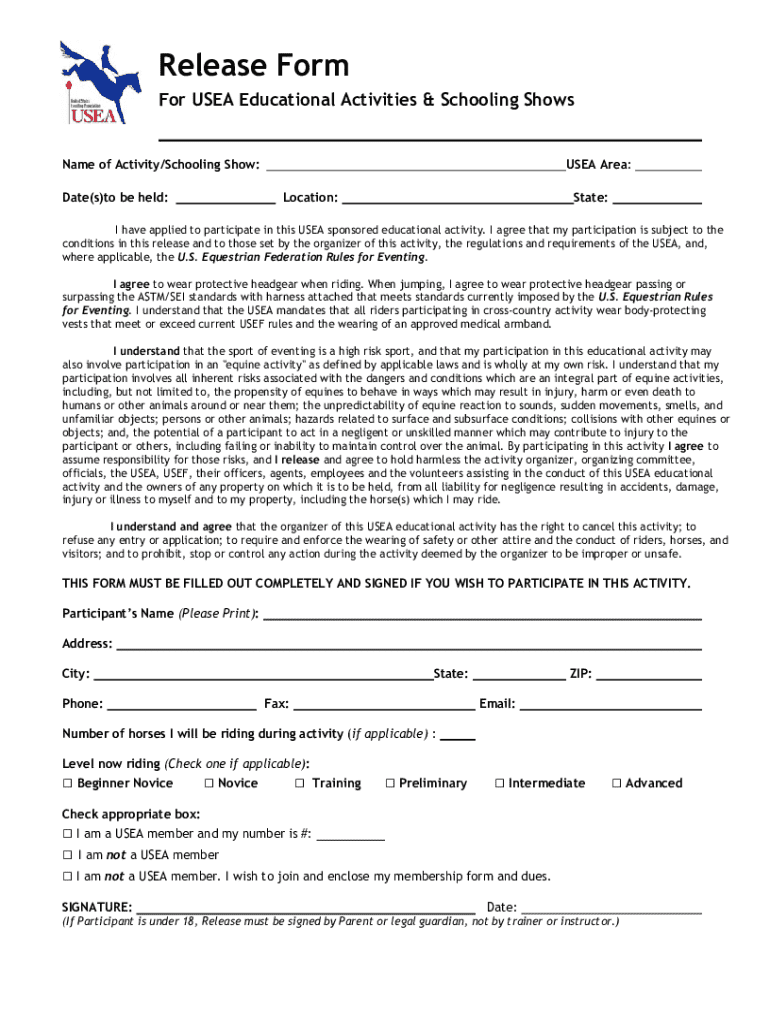 Release Form For USEA Educational Activities & Schooling ShowsName of Activity/Schooling Show: Date(s)to be held:USEA Area: Location:State:I have applied to participate in this USEA sponsored educational
