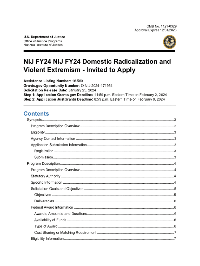 OMB No. 11210329 Approval Expires 12/31/2023 U.S. Department of Justice Office of Justice Programs National Institute of Justice FY24 NIL FY24 Domestic Radicalization and Violent Extremism Invited