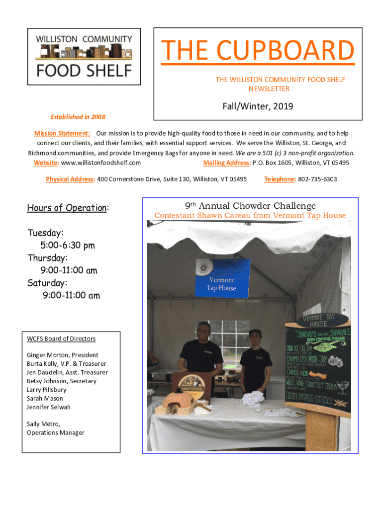 THE CUPBOARD THE WILLISTON COMMUNITY FOOD SHELF NEWSLETTERFall/Winter, 2019 Established in 2008 Mission Statement: Our mission is to provide high quality food to those in need in our community, and