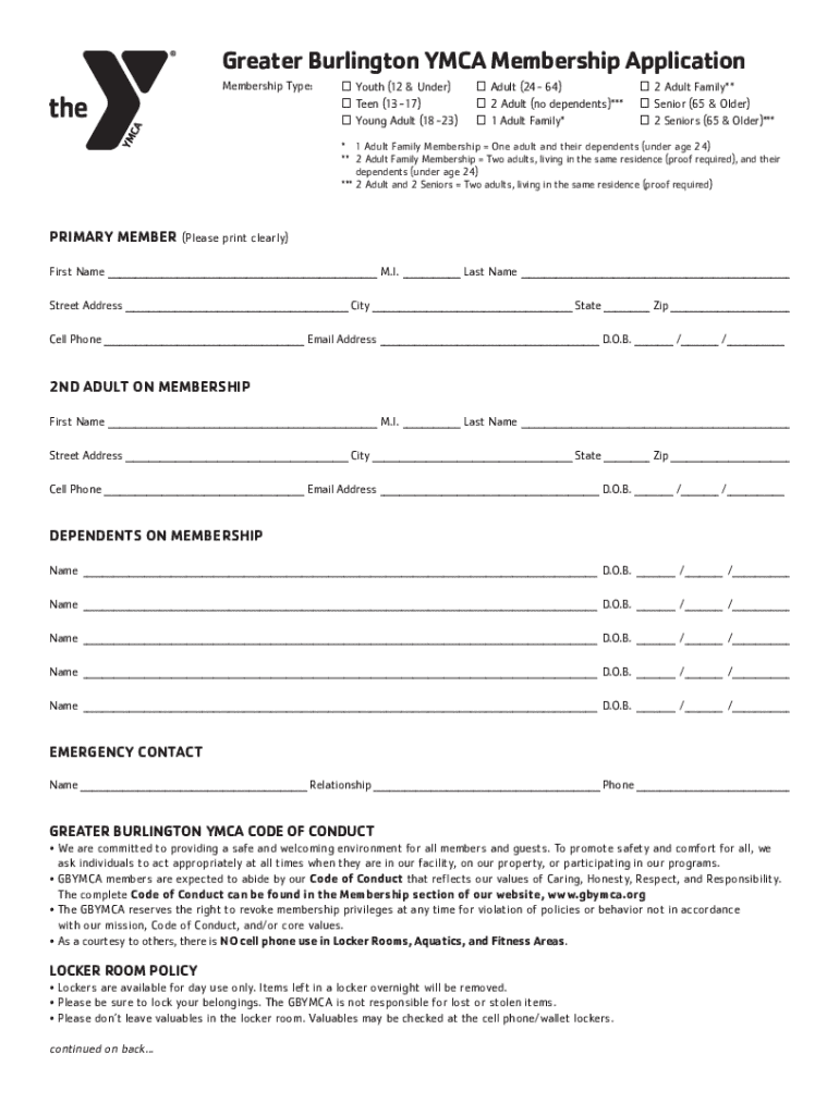 Greater Burlington YMCA Membership Application Membership Type:o Youth (12 & Under) o Teen (13 17) o Young Adult (18 23)o Adult (24 64) o 2 Adult (no dependents)*** o 1 Adult Family×o 2 Adult Family**