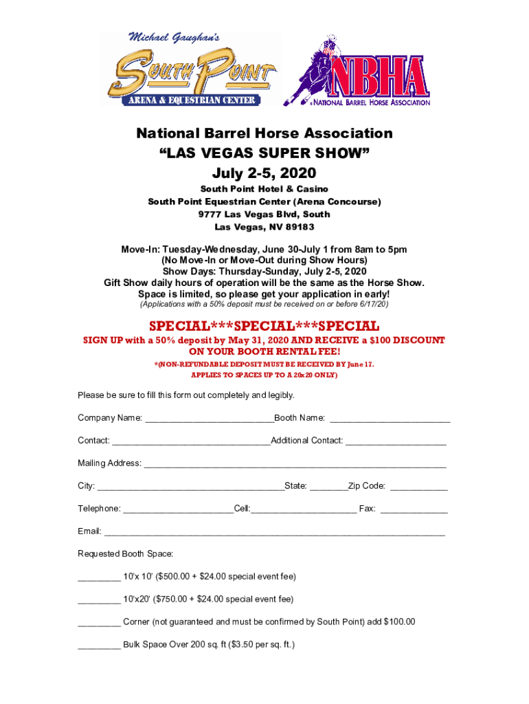 National Barrel Horse Association LAS VEGAS SUPER SHOW July 25, 2020 South Point Hotel & Casino South Point Equestrian Center (Arena Concourse) 9777 Las Vegas Blvd, South Las Vegas, NV 89183MoveIn: