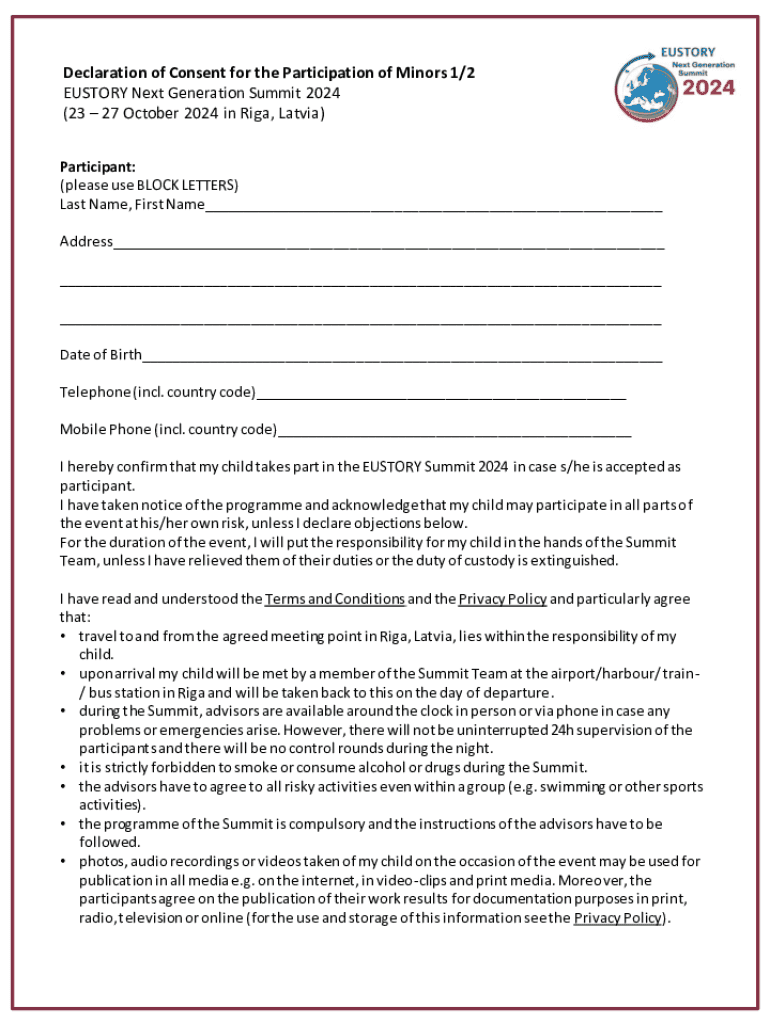 Declaration of Consent for the Participation of Minors 1/2 EUSTORY Next Generation Summit 2024 (23 27 October 2024 in Riga, Latvia) Participant: (please use BLOCK LETTERS) Last Name, First Name___Address___