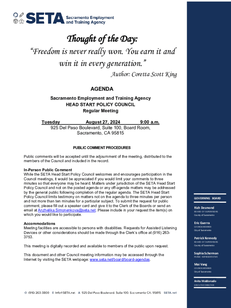 Thought of the Day: Freedom is never really won. You earn it and win it in every generation. Author: Coretta Scott King AGENDA Sacramento Employment and Training Agency HEAD START POLICY COUNCIL Regular