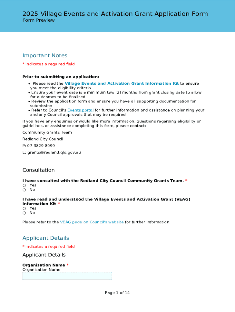 2025 Village Events and Activation Grant Application Form Form PreviewImportant Notes * indicates a required eld Prior to submitting an application: Please read the Village Events and Activation Grant