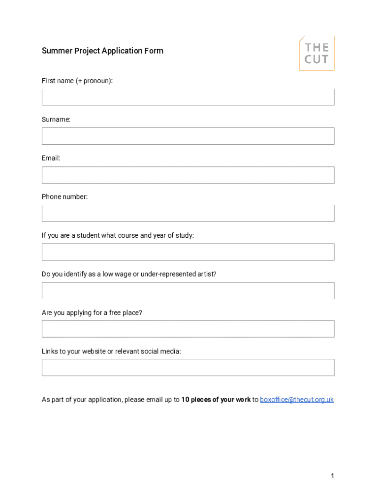 Summer Project Application Formalist name (+ pronoun):Surname:Email:Phone number:If you are a student what course and year of study:Do you identify as a low wage or underrepresented artist? Are you