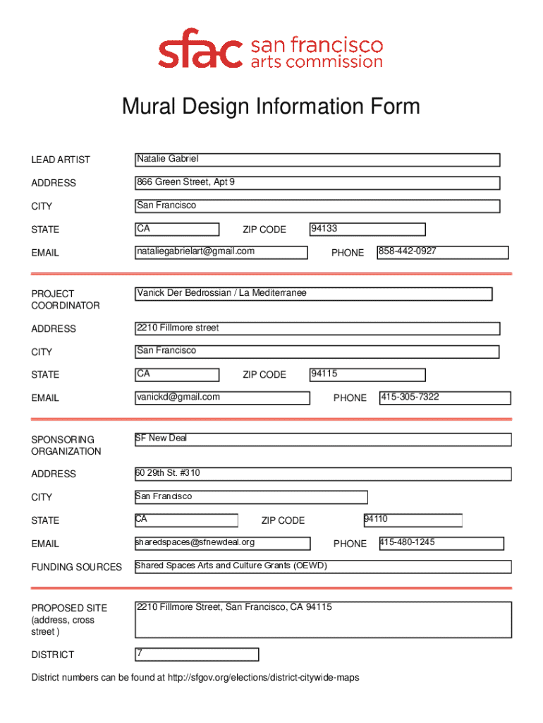 Mural Design Information Form LEAD ARTIST Natalie GabrielADDRESS866 Green Street, Apt 9CITYSan FranciscoSTATECAEMAILnataliegabrielart@gmail.comPROJECT COORDINATORVanick Her Belorussian / La MediterraneeADDRESS2210