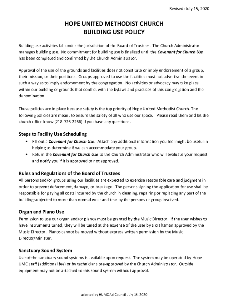 Revised: July 15, 2020HOPE UNITED METHODIST CHURCH BUILDING USE POLICY Building use activities fall under the jurisdiction of the Board of Trustees. The Church Administrator manages building use.