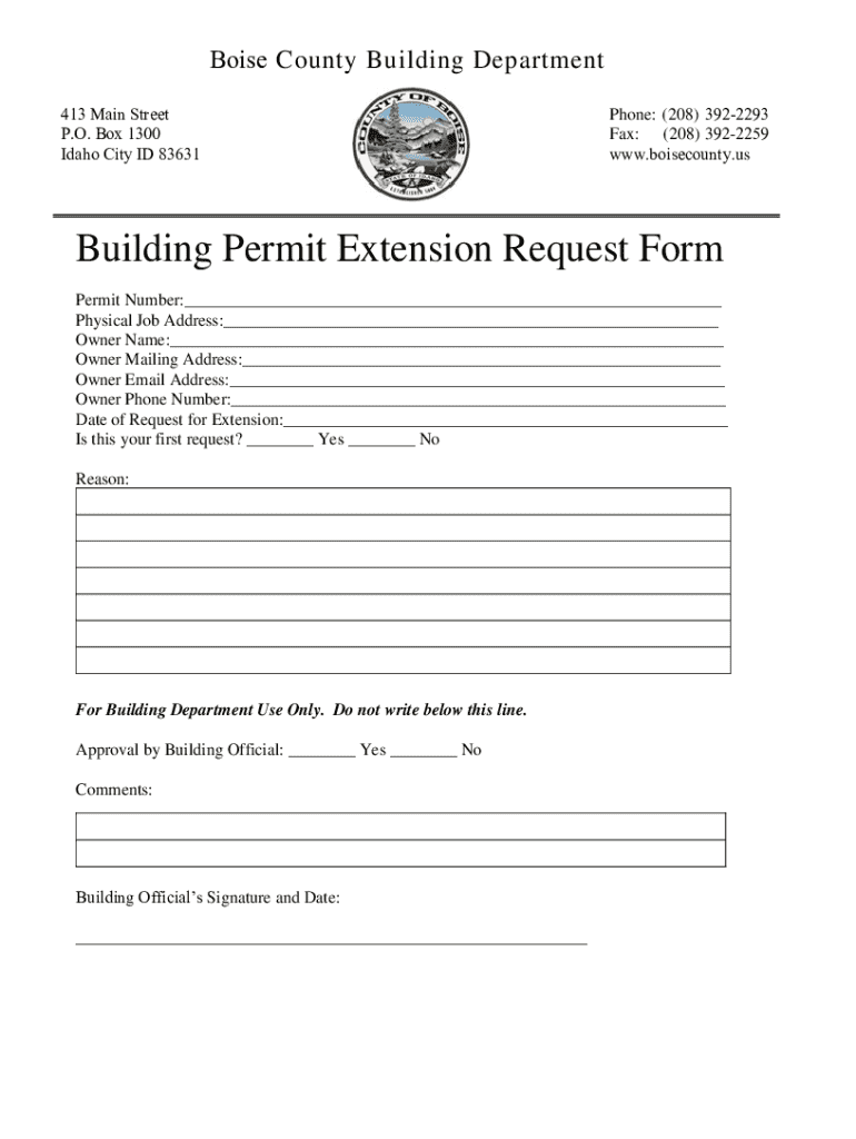 Boise County Building Department 413 Main Street P.O. Box 1300 Idaho City ID 83631Phone: (208) 3922293 Fax: (208) 3922259 www.boisecounty.usBuilding Permit Extension Request Form Permit Number:___
