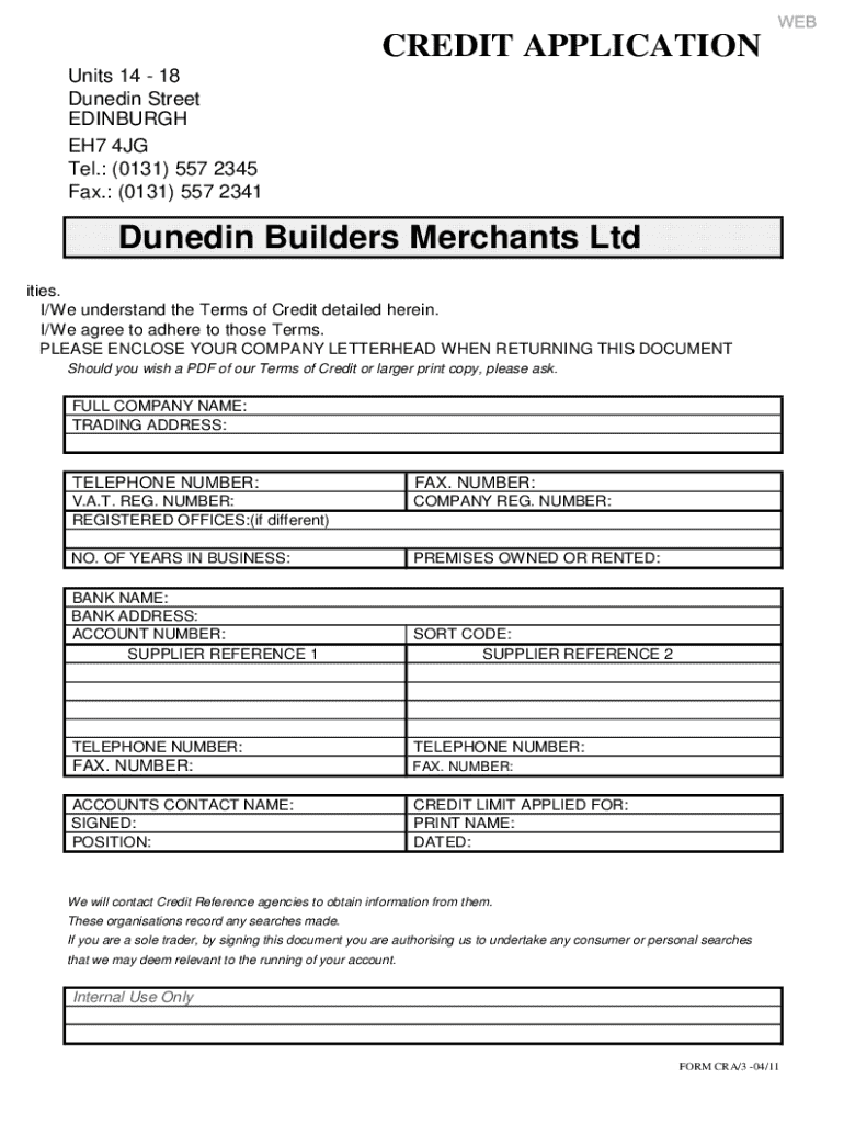 CREDIT APPLICATION Units 14 18 Dunedin Street EDINBURGH EH7 4JG Tel.: (0131) 557 2345 Fax.: (0131) 557 2341Dunedin Builders Merchants Ltd facilities. I/We understand the Terms of Credit detailed herein.