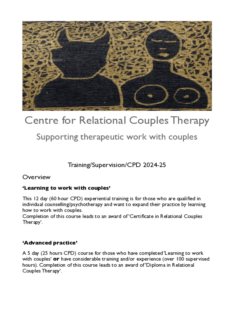 Centre for Relational Couples Therapy Supporting therapeutic work with couples Training/Supervision/CPD 202425 Overview Learning to work with couples This 12 day (60 hour CPD) experiential training