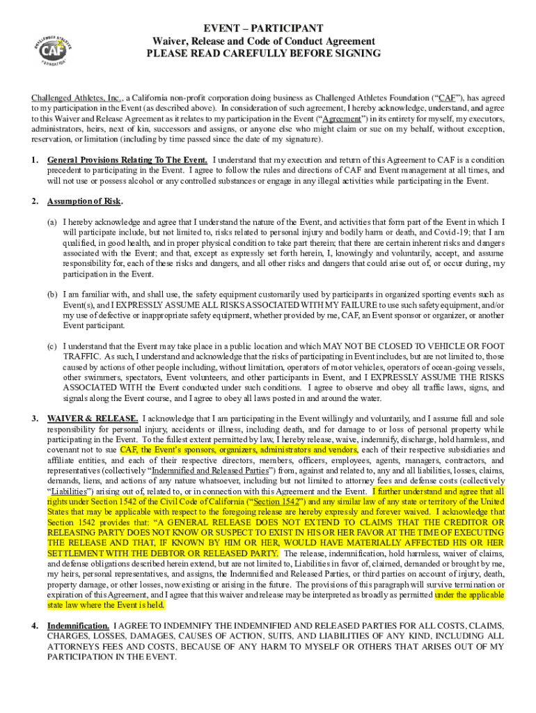 EVENT PARTICIPANT Waiver, Release and Code of Conduct Agreement PLEASE READ CAREFULLY BEFORE SIGNINGChallenged Athletes, Inc., a California nonprofit corporation doing business as Challenged Athletes