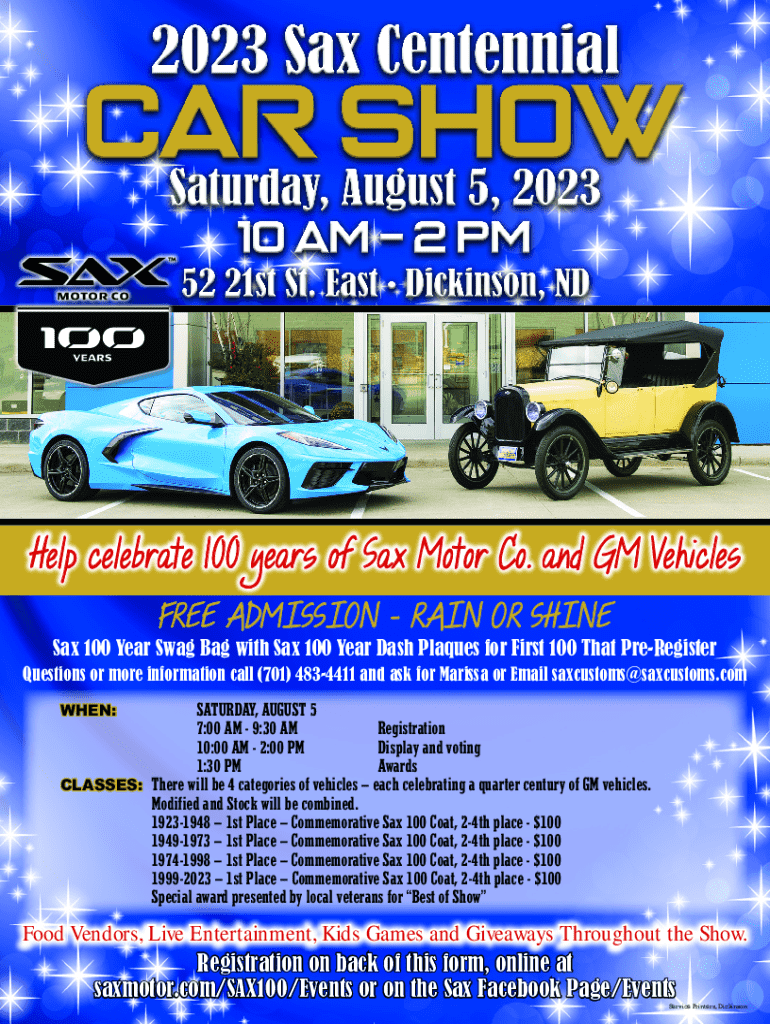 Help celebrate 100 years of Sax Motor Co. and GM Vehicles FREE ADMISSION RAIN OR SHINESax 100 Year Swag Bag with Sax 100 Year Dash Plaques for First 100 That PreRegister Questions or more information