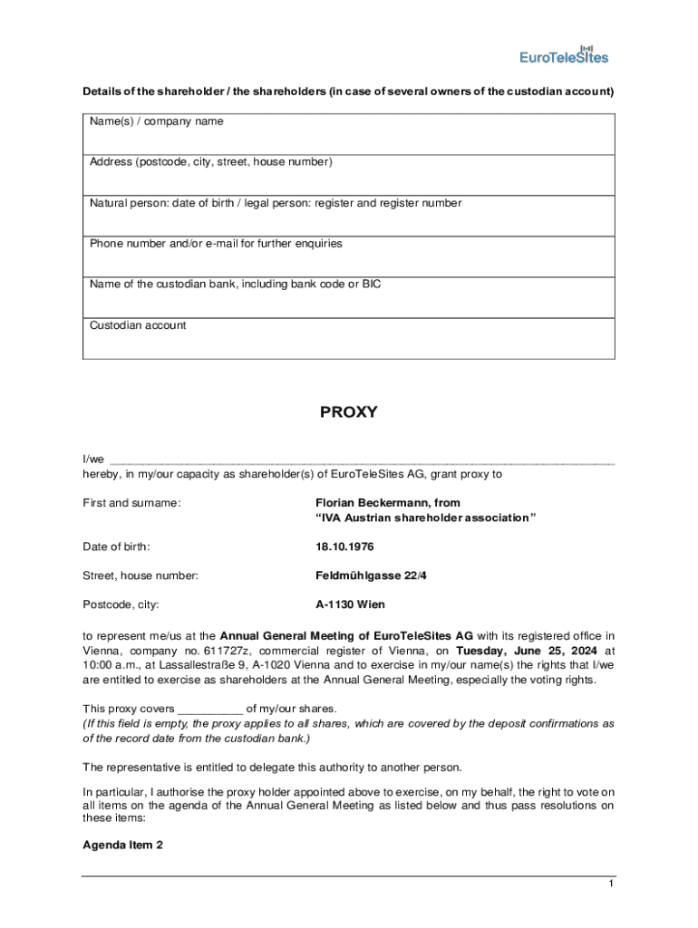 Details of the shareholder / the shareholders (in case of several owners of the custodian account) Name(s) / company nameAddress (postcode, city, street, house number)Natural person: date of birth