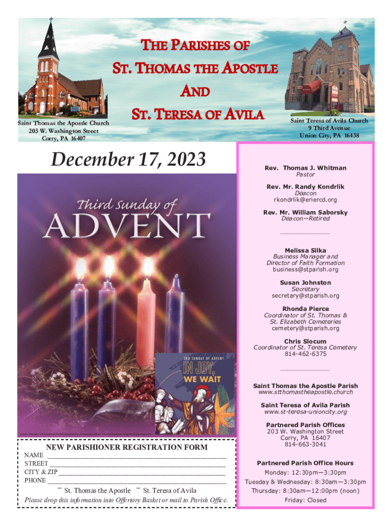 Saint Thomas the Apostle Church 203 W. Washington Street Sorry, PA 16407THE PARISHES OF ST. THOMAS THE APOSTLE AND ST. TERESA OF AVILADecember 17, 2023Saint Teresa of Avila Church 9 Third Avenue Union