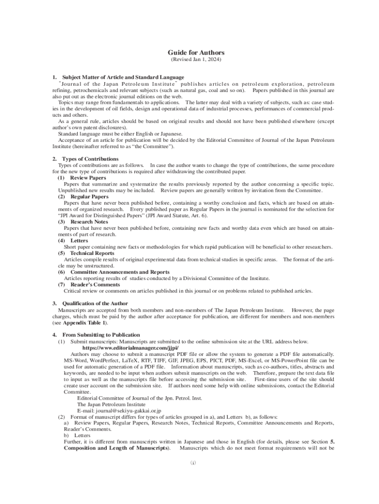 Guide for Authors (Revised Jan 1, 2024)1.Subject of Article and Standard Language Journal of the Japan Petroleum Institute publishes articles on petroleum exploration, petroleum refining, petrochemicals