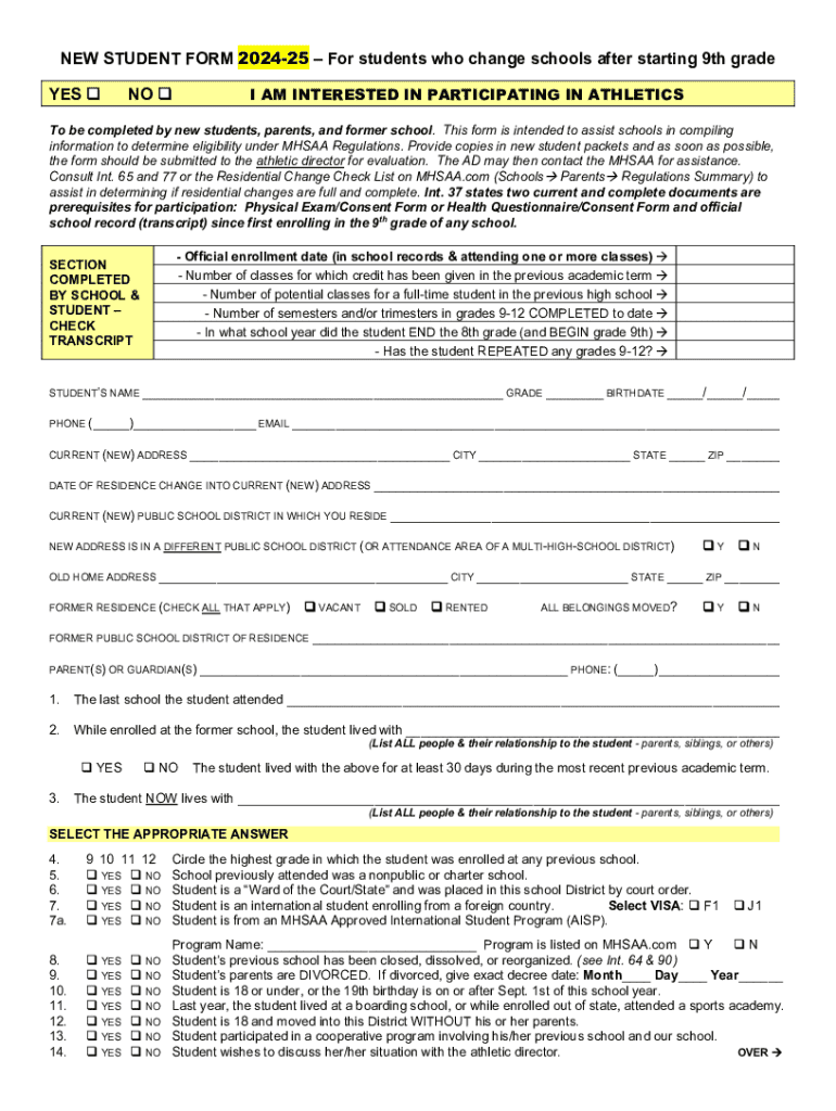 NEW STUDENT FORM 202425 For students who change schools after starting 9th grade YES NO I AM INTERESTED IN PARTICIPATING IN ATHLETICSTo be completed by new students, parents, and former school. This
