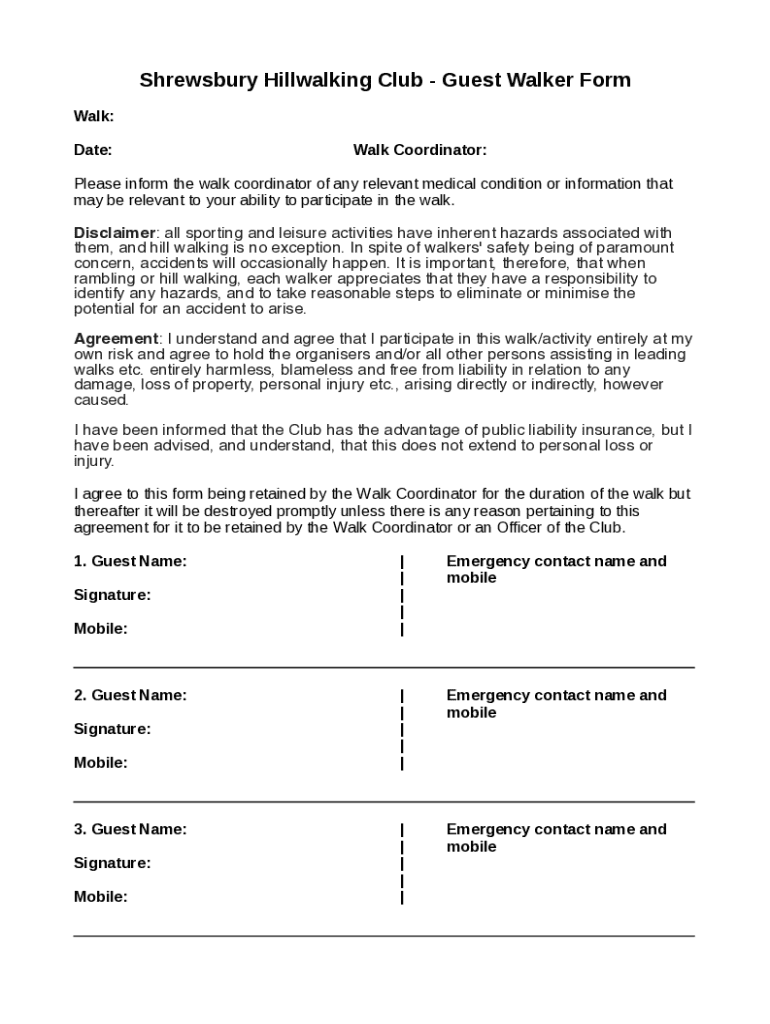 Shrewsbury Hill walking Club Guest Walker Form Walk: Date:Walk Coordinator:Please inform the walk coordinator of any relevant medical condition or information that may be relevant to your ability