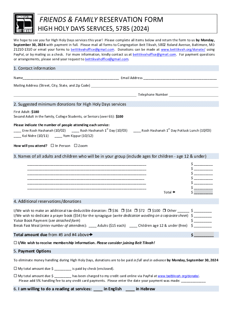FRIENDS & FAMILY RESERVATION FORM HIGH HOLY DAYS SERVICES, 5785 (2024) We hope to see you for High Holy Days services this year! Please complete all items below and return the form to us by Monday,
