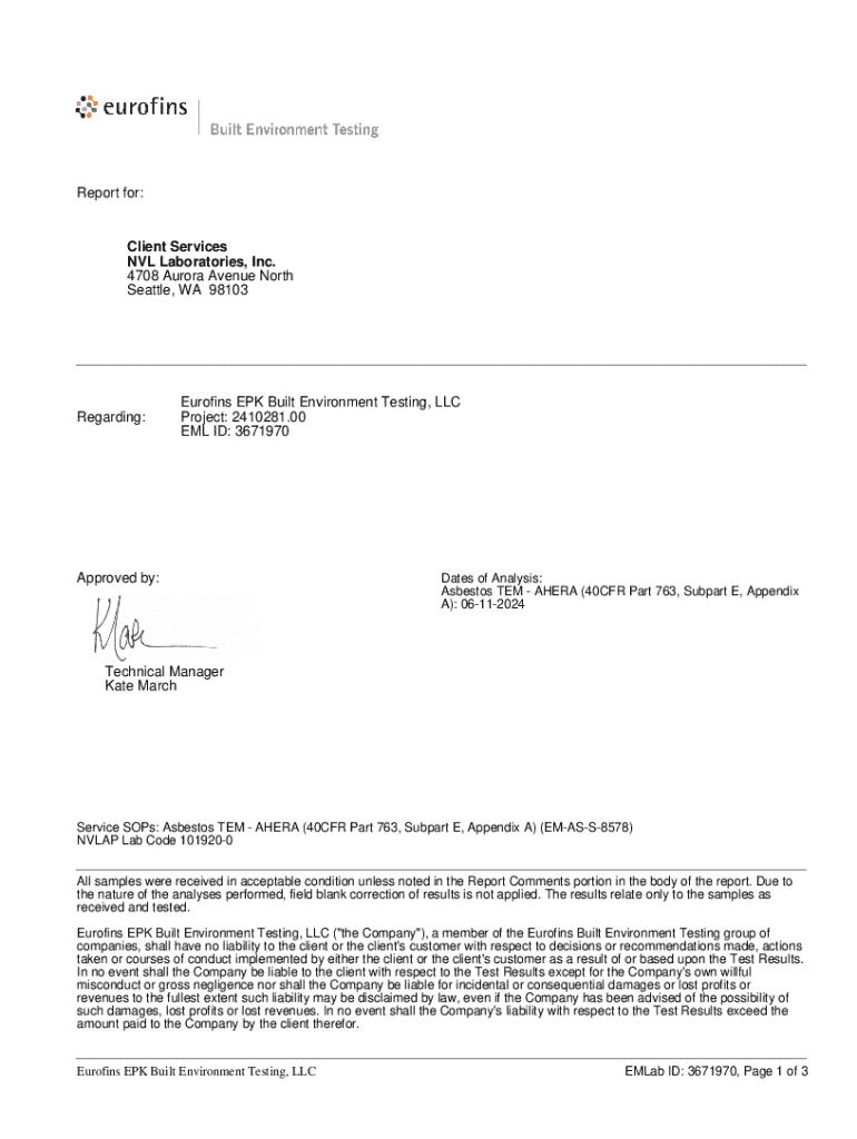 Report for:Client Services NFL Laboratories, Inc. 4708 Aurora Avenue North Seattle, WA 98103Regarding:Euro fins ELK Built Environment Testing, LLC Project: 2410281.00 EML ID: 3671970Approved by:Dates