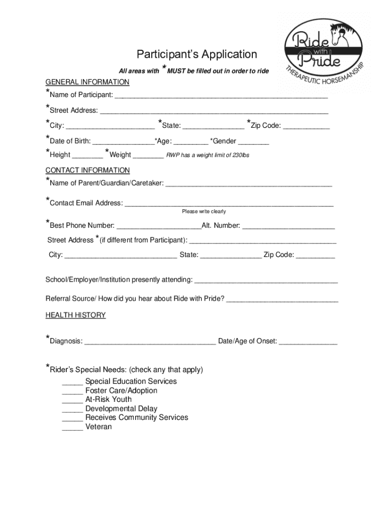 Participants Application All areas with * MUST be filled out in order to ride GENERAL INFORMATION*Name of Participant: ___ *Street Address: ___ *City: ___ *State: ___ *Zip Code: ___ *Date of Birth:
