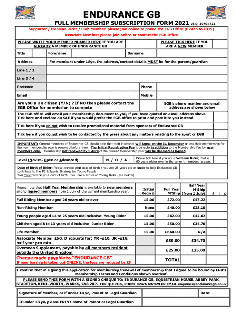 ENDURANCE GBFULL MEMBERSHIP SUBSCRIPTION FORM 2021 v8.0, 10/04/21 Supporter / Pleasure Rider / Club Member: please join online or phone the EGB Office (02476 697929) Associate Member: please join