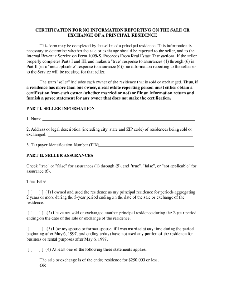 CERTIFICATION FOR NO INFORMATION REPORTING ON THE SALE OR EXCHANGE OF A PRINCIPAL RESIDENCE This form may be completed by the seller of a principal residence. This information is necessary to determine