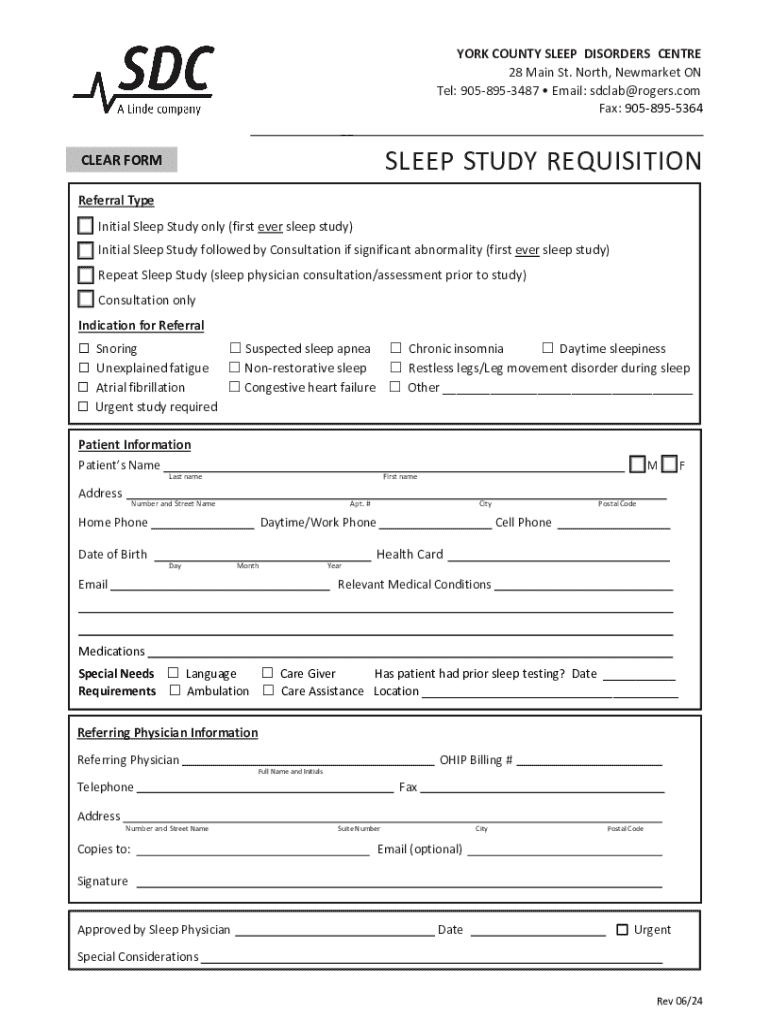 YORK COUNTY SLEEP DISORDERS Center 28 Main St. North, Newmarket ON Tel: 9058953487 Email: sdclab@rogers.com Fax: 9058955364 __SLEEP STUDY REQUISITIONCLEAR FORM Referral Type Initial Sleep Study only