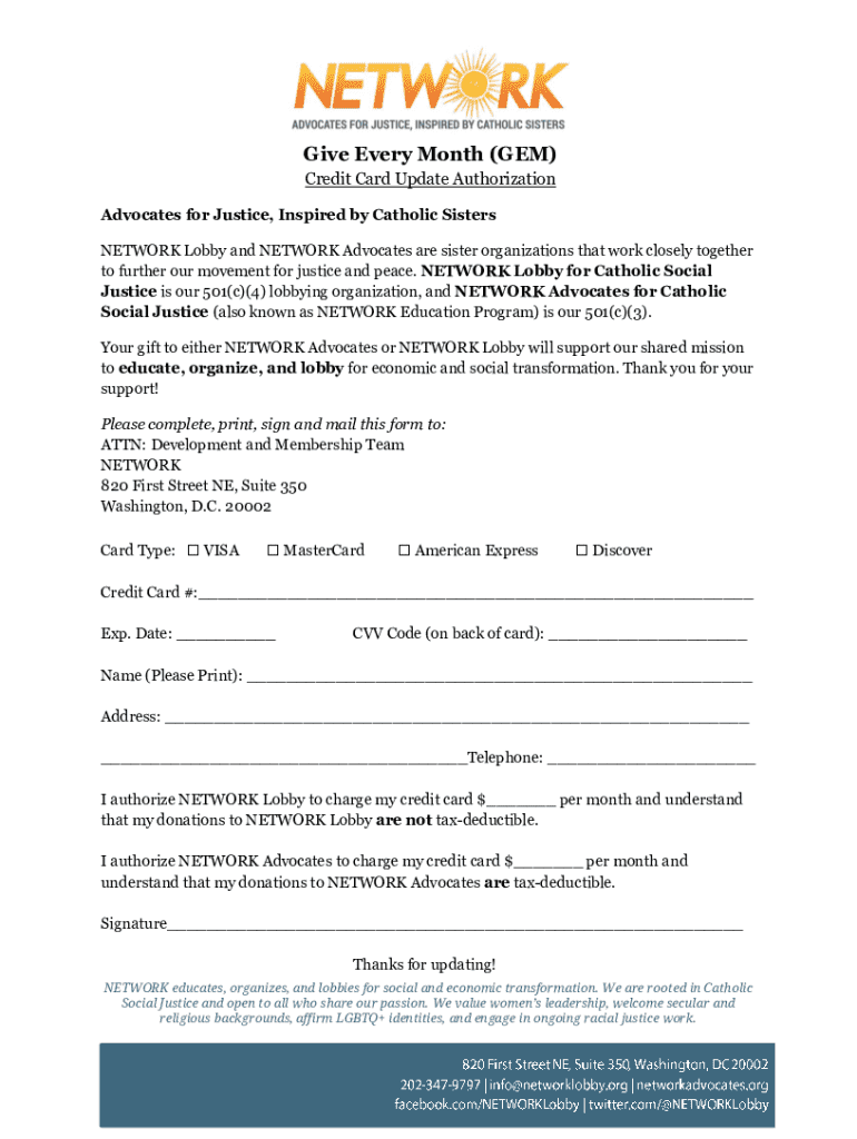 Give Every Month (GEM) Credit Card Update Authorization Advocates for Justice, Inspired by Catholic Sisters NETWORK Lobby and NETWORK Advocates are sister organizations that work closely together