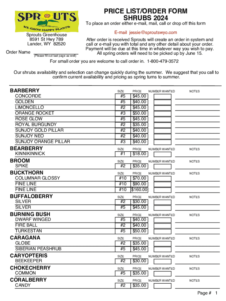 PRICE LIST/ORDER FORM SHRUBS 2024To place an order either email, mail, call or drop off this form Sprouts Greenhouse 8591 St Hwy 789 Lander, WY 82520 Order Name(Please fill out last page as well)Email