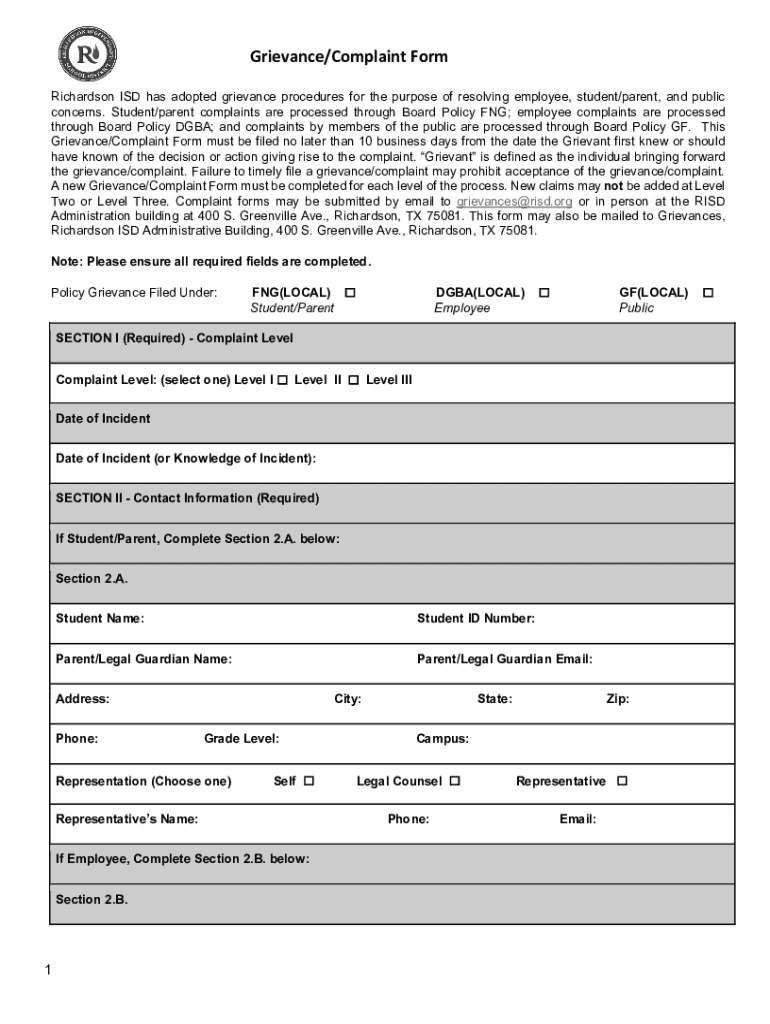 Grievance/Complaint Form Richardson ISD has adopted grievance procedures for the purpose of resolving employee, student/parent, and public concerns. Student/parent complaints are processed through