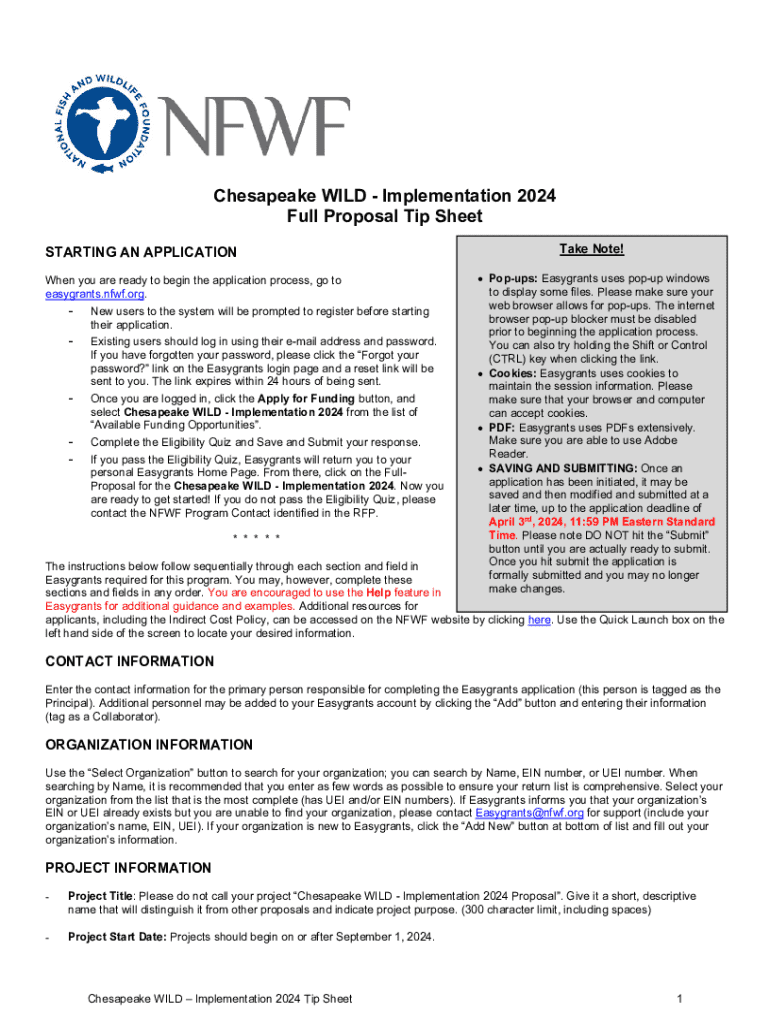 Chesapeake WILD Implementation 2024 Full Proposal Tip Sheet STARTING AN APPLICATION When you are ready to begin the application process, go to easygrants.nfwf.org. New users to the system will be