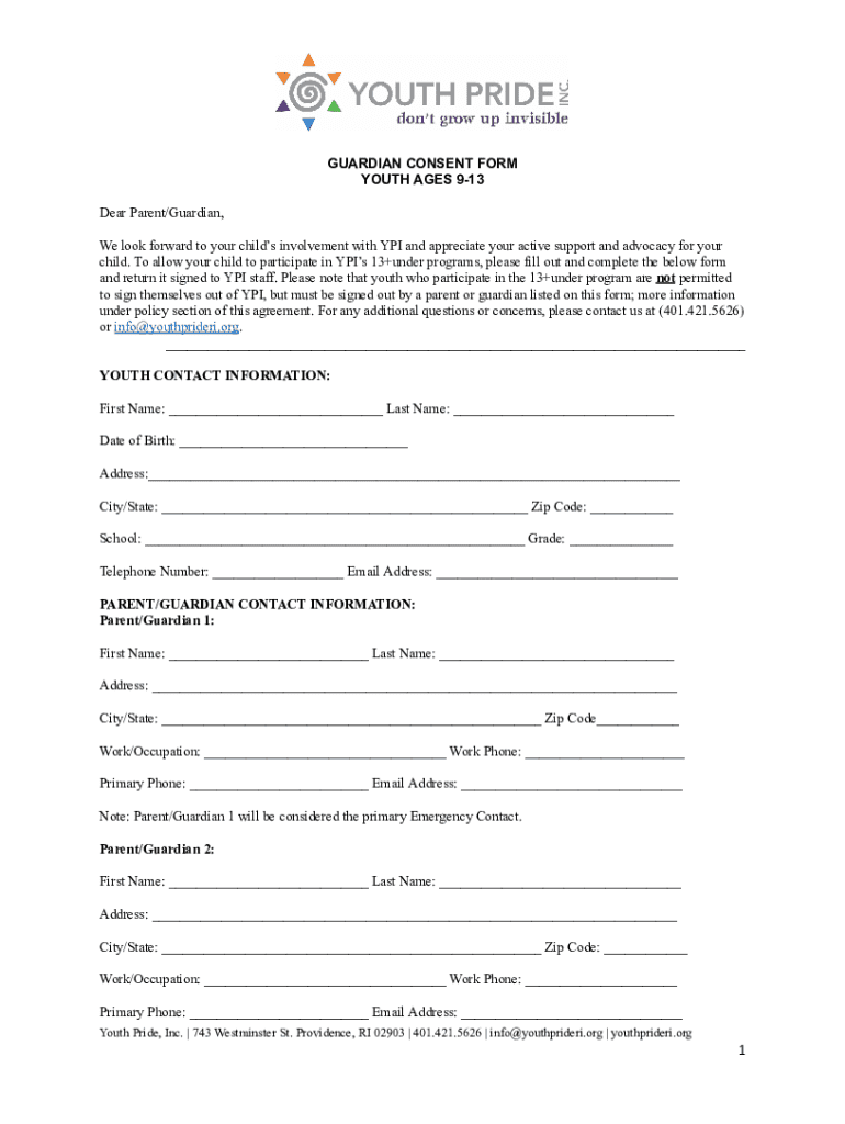 GUARDIAN CONSENT FORM YOUTH AGES 913 Dear Parent/Guardian, We look forward to your children involvement with CPI and appreciate your active support and advocacy for your child. To allow your child