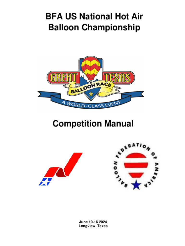 BFA US National Hot Air Balloon ChampionshipCompetition Manual June 1016 2024 Longview, Testable of Contents SECTION I Even DETAILS ..................................................................................................................................................