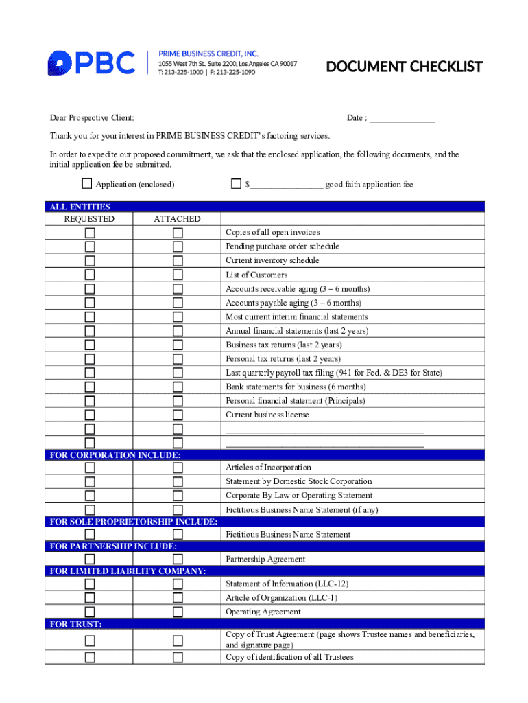 DOCUMENT CHECKLISTDear Prospective Client:Date : ___Thank you for your interest in PRIME BUSINESS Credits factoring services.