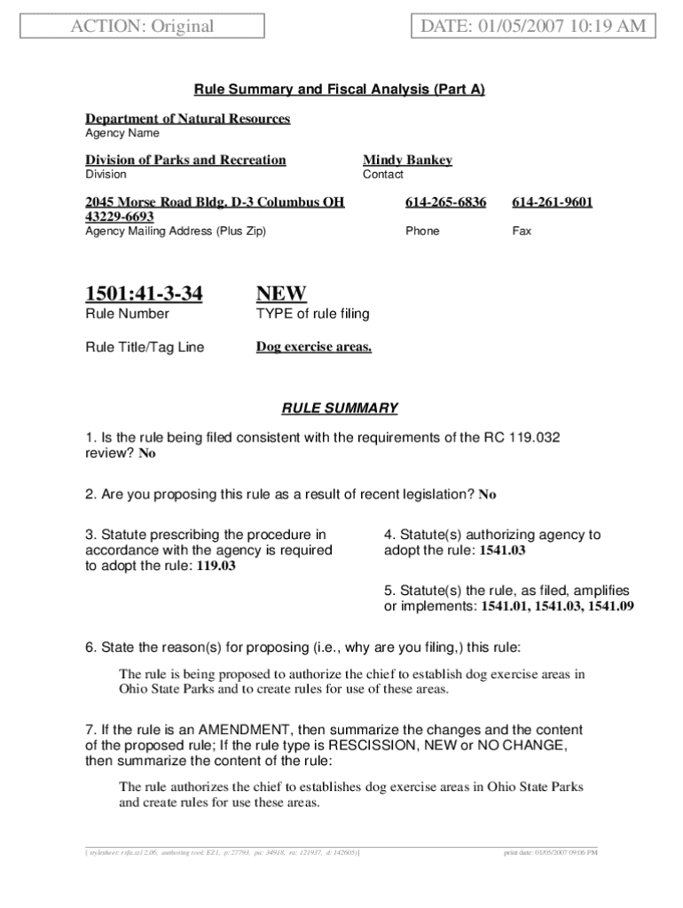 ACTION: OriginalDATE: 01/05/2007 10:19 AMRule Summary and Fiscal Analysis (Part A) Department of Natural Resources Agency NameDivision of Parks and RecreationMindy BankeyDivisionContact2045 Morse