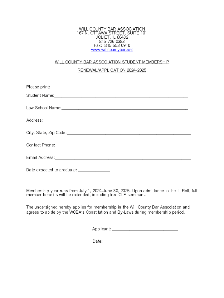 WILL COUNTY BAR ASSOCIATION 167 N. OTTAWA STREET, SUITE 101 JOLIET, IL 60432 8157260383 Fax: 8155530910 www.willcountybar.net WILL COUNTY BAR ASSOCIATION STUDENT MEMBERSHIP RENEWAL/APPLICATION 20242025Please