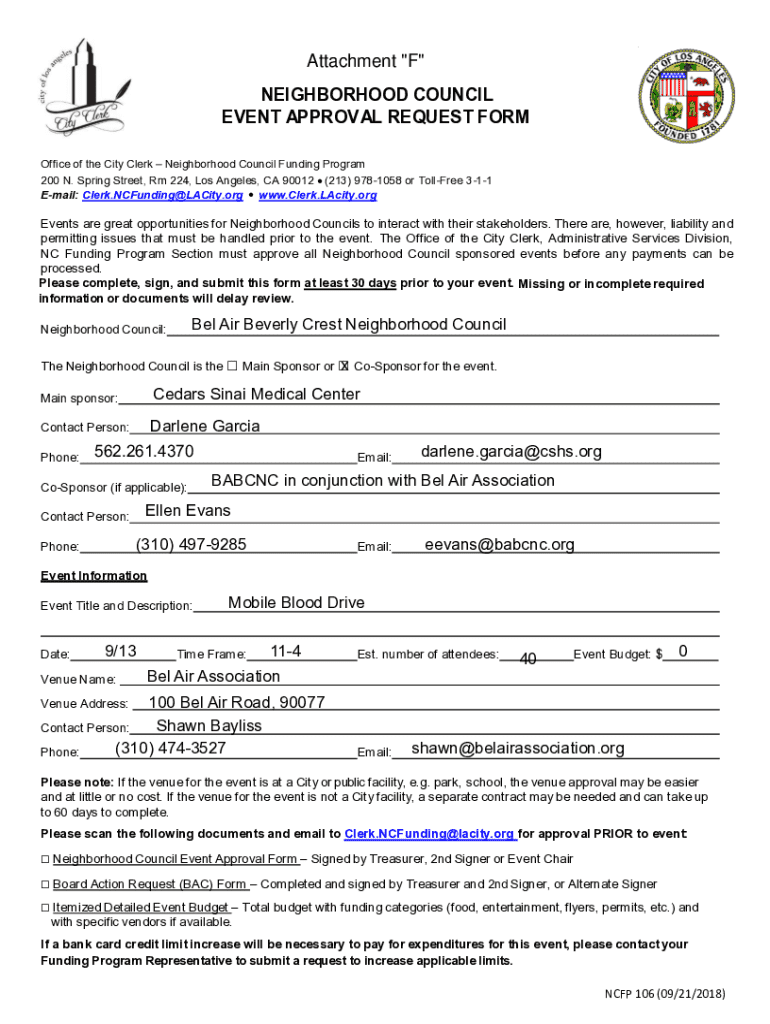 Attachment \"F\"NEIGHBORHOOD COUNCIL EVENT APPROVAL REQUEST FORM Office of the City Clerk Neighborhood Council Funding Program 200 N. Spring Street, Rm 224, Los Angeles, CA 90012 (213) 9781058 or