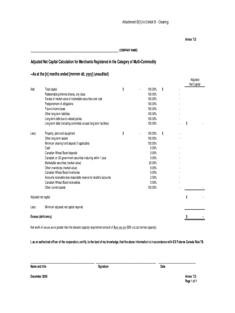 Attachment B(3) to Exhibit B ClearingAnnex 7. D___(COMPANY NAME)Adjusted Net Capital Calculation for Merchants Registered in the Category of MultiCommodity