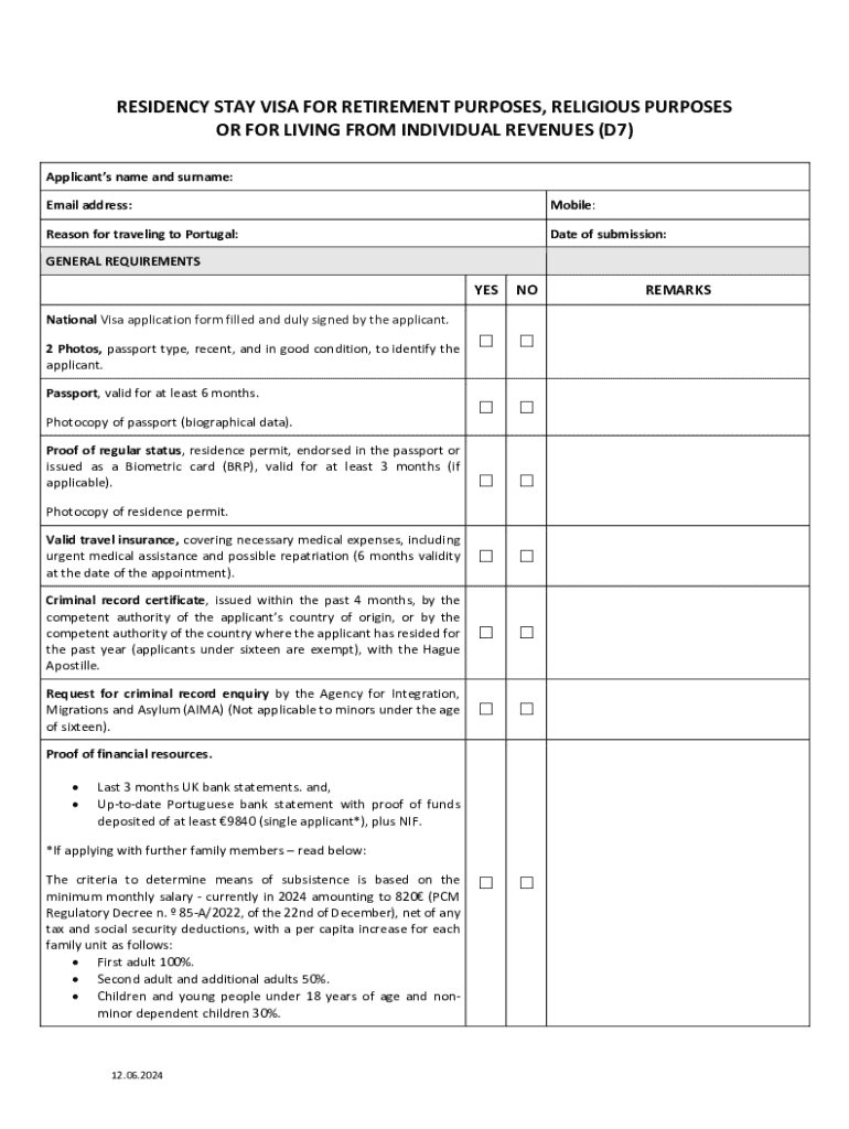 RESIDENCY STAY VISA FOR RETIREMENT PURPOSES, RELIGIOUS PURPOSES OR FOR LIVING FROM INDIVIDUAL REVENUES (D7) Applicants name and surname: Email address:Mobile:Reason for traveling to Portugal:Date