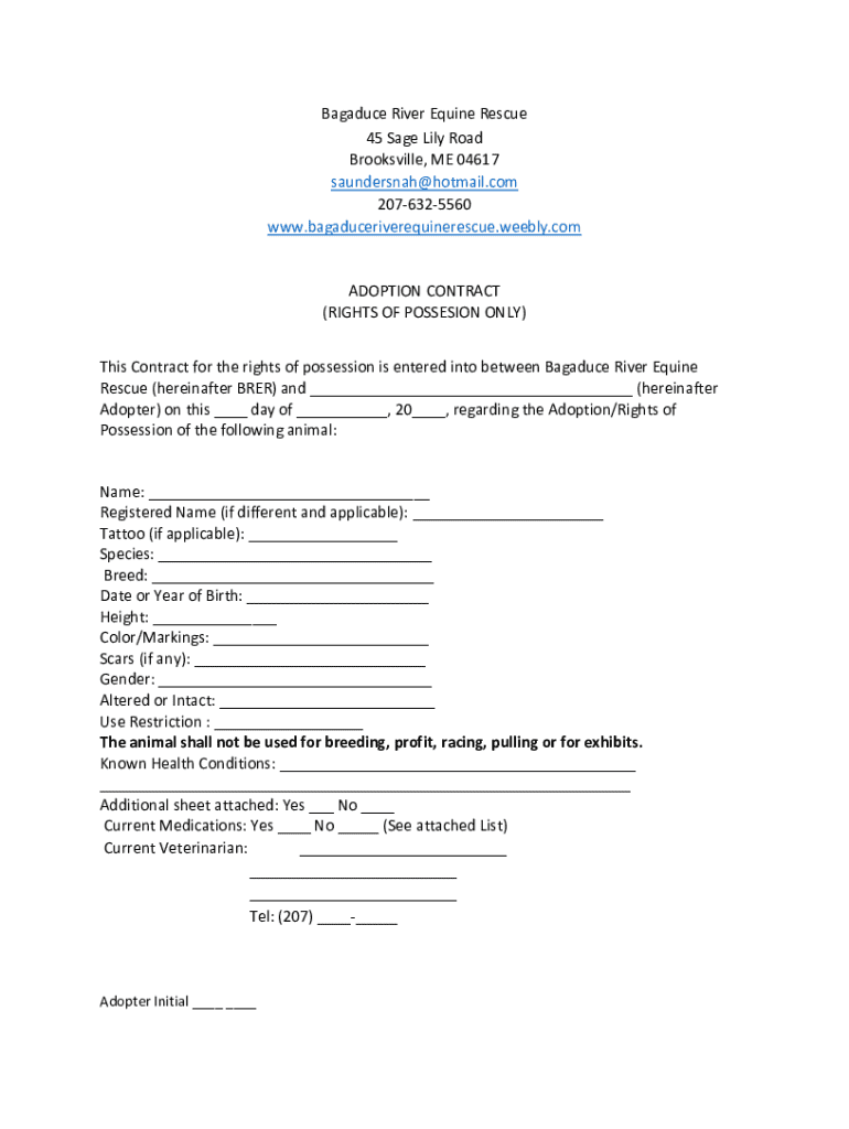 Bagaduce River Equine Rescue 45 Sage Lily Road Brooksville, ME 04617 saundersnah@hotmail.com 2076325560 www.bagaduceriverequinerescue.weebly.comADOPTION CONTRACT (RIGHTS OF POSSESION ONLY) This Contract