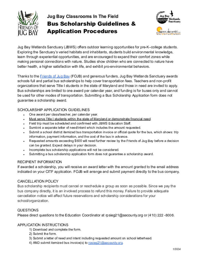Jug Bay Classrooms In The FieldBus Scholarship Guidelines & Application Procedures Jug Bay Wetlands Sanctuary (JBWS) offers outdoor learning opportunities for preKcollege students. Exploring the Sanctuarys