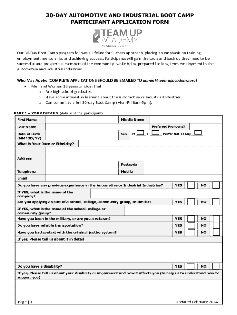 30DAY AUTOMOTIVE AND INDUSTRIAL BOOT CAMP PARTICIPANT APPLICATION FORMOur 30Day Boot Camp program follows a Lifeline for Success approach, placing an emphasis on training, employment, mentorship,