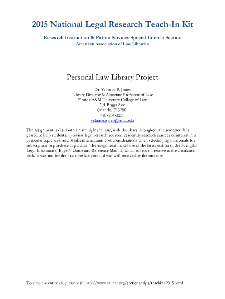 2015 National Legal Research Teaching Kit Research Instruction & Patron Services Special Interest Section American Association of Law LibrariesPersonal Law Library Project Dr. Yolanda P. Jones Library