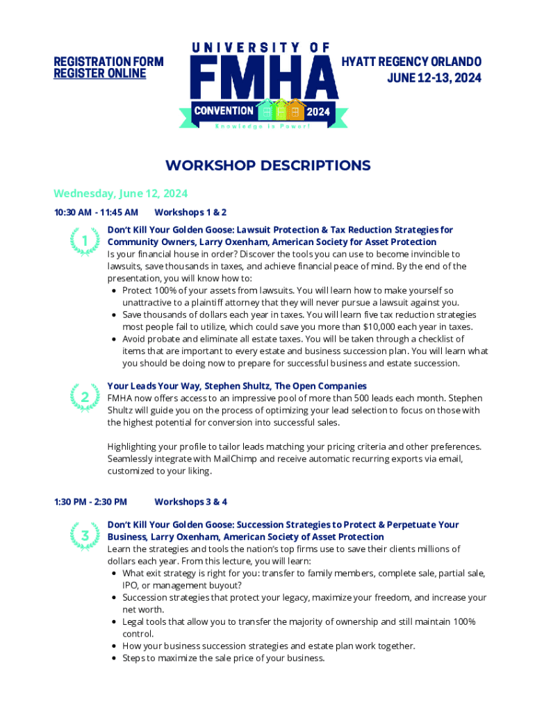 HYATT REGENCY ORLANDO JUNE 1213, 2024REGISTRATION FORM REGISTER ONLINEWORKSHOP DESCRIPTIONS Wednesday, June 12, 2024 10:30 AM 11:45 AM12Workshops 1 & 2Dont Kill Your Golden Goose: Lawsuit Protection