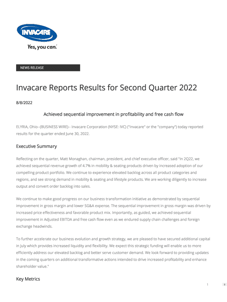 Get the free Invacare Reports Results for Second Quarter 2022 - Newsroom
