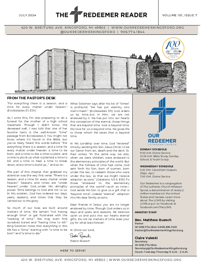 JULY 2024V O L U M E 1 0 1 , I S S UE 7420 W. BREITUNG AVE. KINGSFORD, MI 49802 | WWW.OURREDEEMERKINGSFORD.ORG @OURREDEEMERKINGSFORD | 906.774.1844FROM THE PASTORS DESK For everything there is a season,