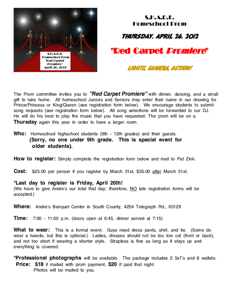S.H.A.R.E. Homeschool Prom Thursday, April 26, 2012\”Red Carpet Premiere\” Lights, Camera, Action! The Prom committee invites you to \”Red Carpet Premiere\” with dinner, dancing, and a small