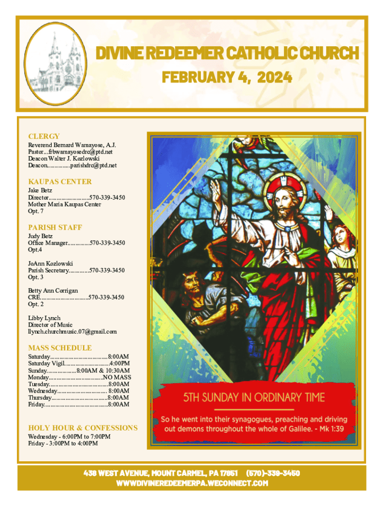 DIVINE REDEEMER CATHOLIC CHURCH FEBRUARY 4, 2024CLERGY Reverend Bernard Comatose, A.J. Pastor...frbwamayosedrc@ptd.net Deacon Walter J. Wazowski Deacon...............parishdrc@ptd.netKAUPAS CENTER